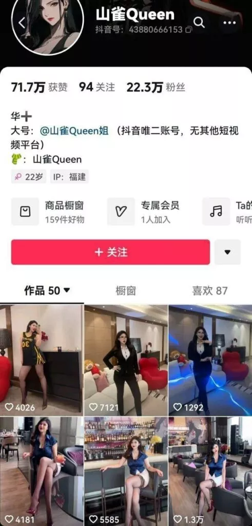 抖音平台上的一位网红,因其丰腴的身材和惊人的曲线而广受欢迎。她的别名是“搔货山雀Queen”,以其微胖的身形成为众多女性的身材标杆。然而,最近她因拍摄果露的大尺度视频而引发热议,似乎是为了吸引金主投资和获取收益。